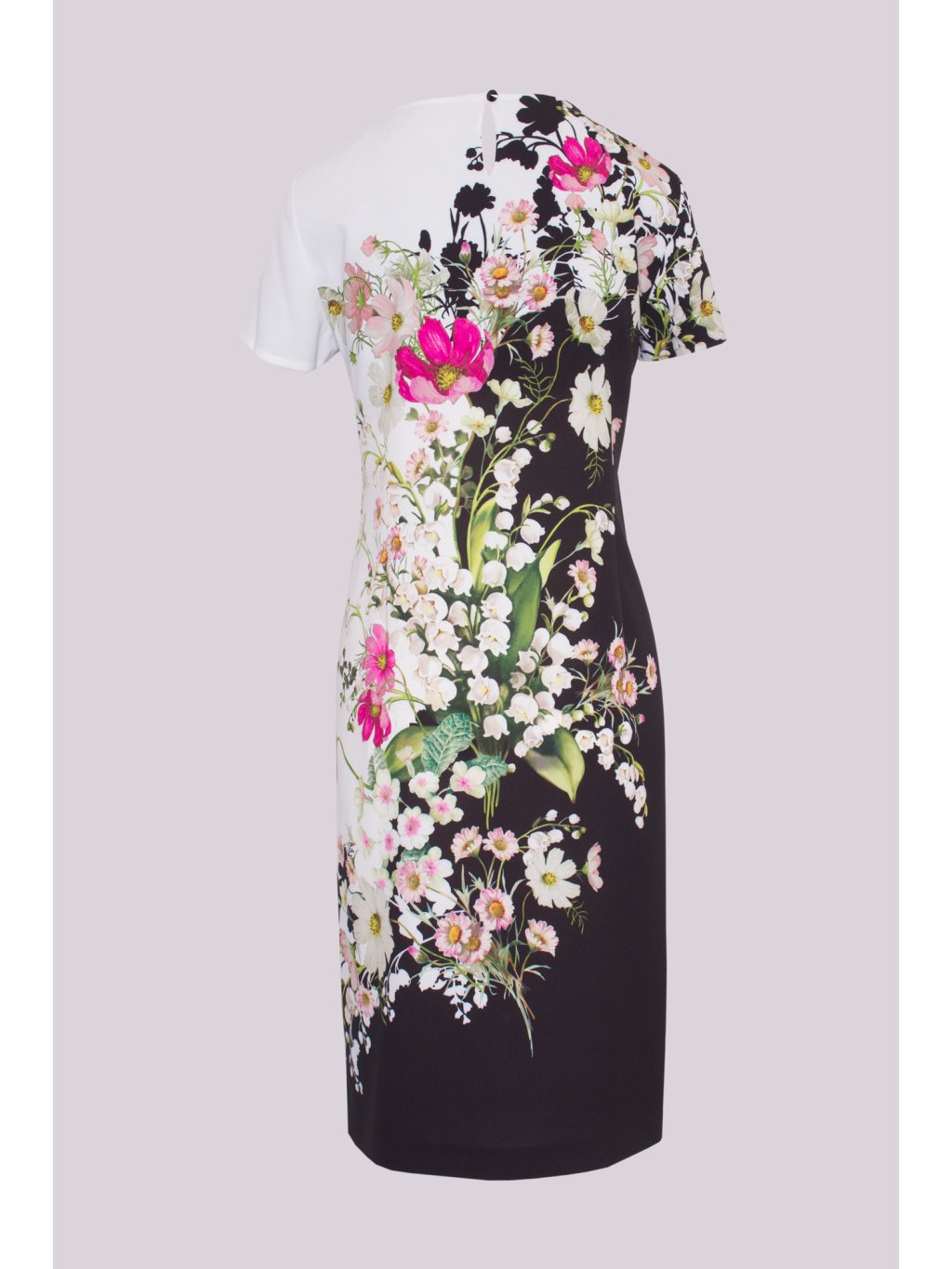 Přiléhavé květinové šaty pod kolena vytváří něžný a romantický dojem. Záševky krásně zvýrazní siluetu těla a podtrhnou ženskost. Vhodné pro slavnostní události.