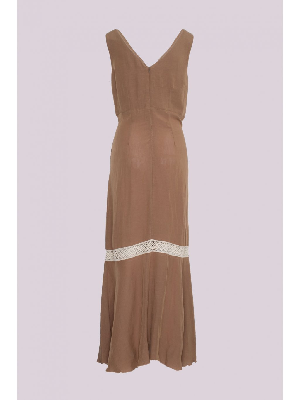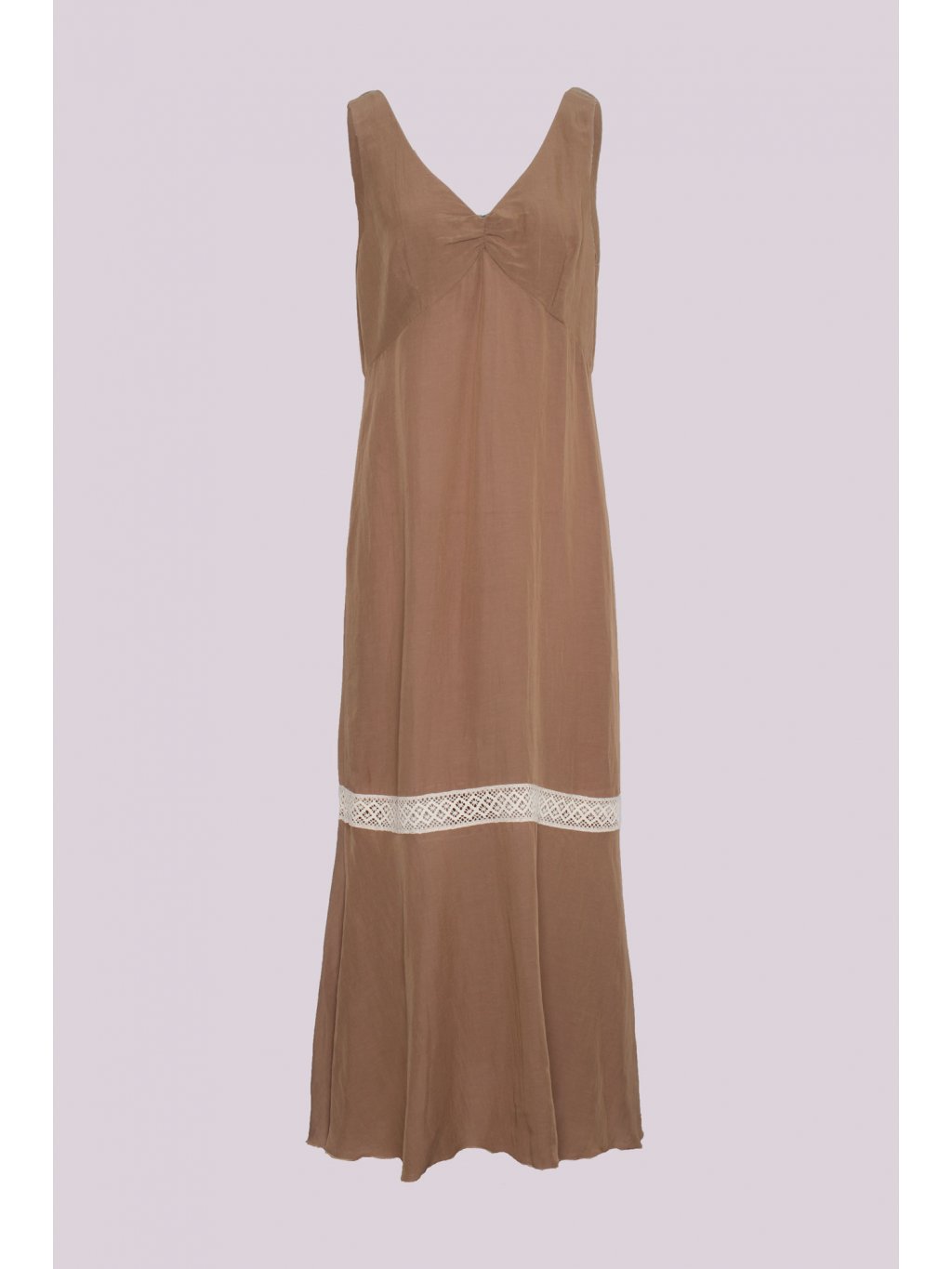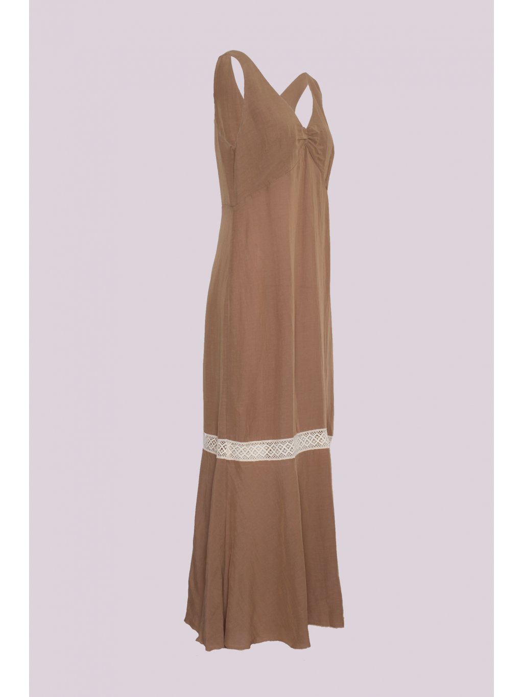 Maxi šaty z velmi příjemného materiálu směsi viskózy a lnu jsou perfektní pro letní horké dny. Zemitá barva s doplňkem bílé krajky přímo vyvolává vzpomínky na dovolenou a klid na pláži