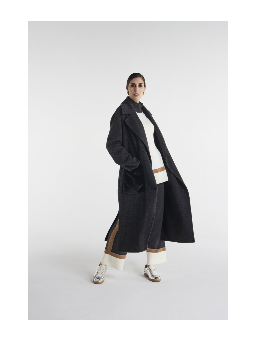 Detaily: Teplý, vlněný materiál s kašmírem, 2 našívané kapsy, pásek ze stejného materiálu, boční rozparky, bez podšívky