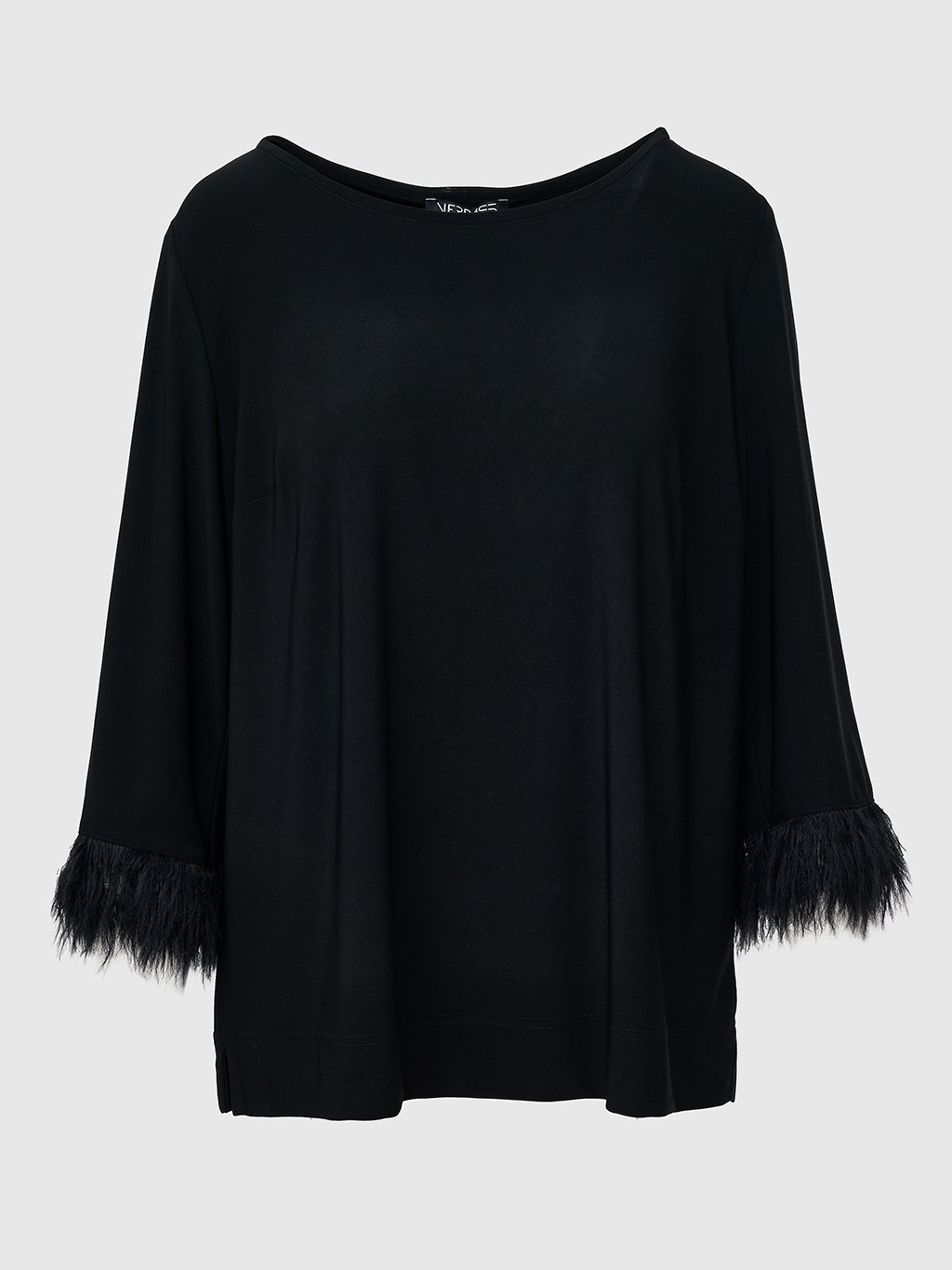 Detaily: Příjemný, měkký a elastický materiál, tříčtvrteční rukáv s dekorativním peřím, rovný spodní lem, prsní záševky