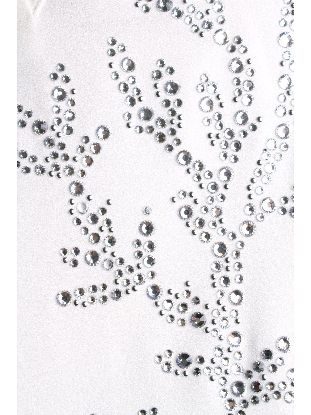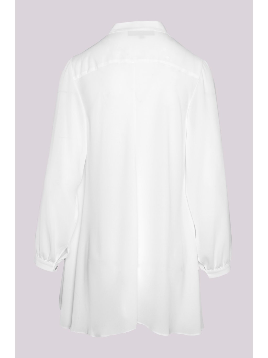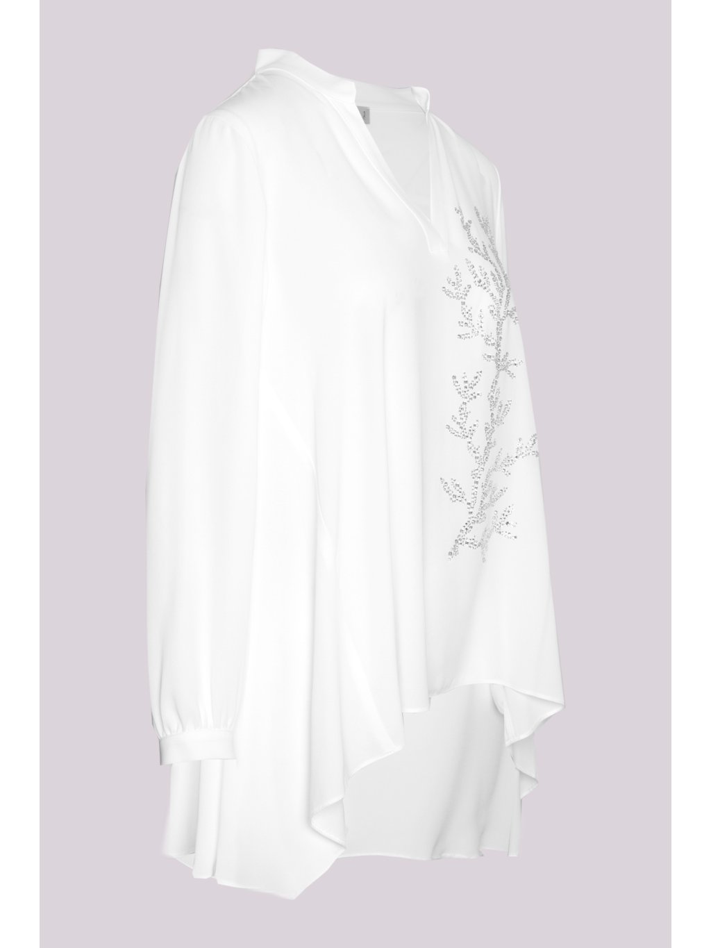 Detaily: Lehký materiál, kamínky ve stříbrné barvě, límeček, asymetrická délka s delšími zády, manzety na rukávech.